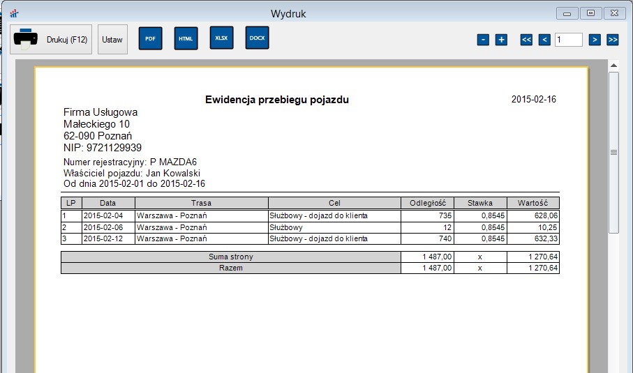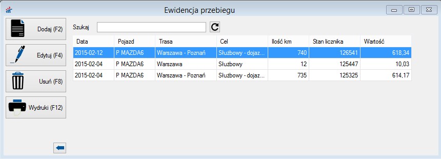 Można również wydrukować ewidencje pojazdów przez wybranie przycisku Wydruki lub klawisza F12.
