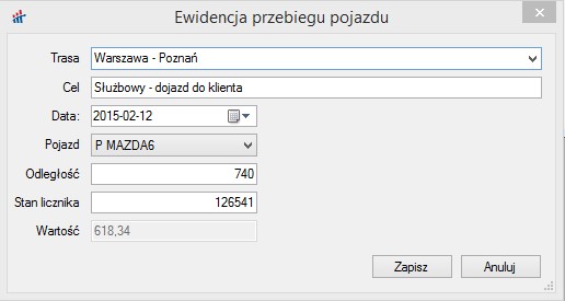 Wprowadzamy w kilometrach przebyty odcinek. Opcjonalnie wprowadzamy stan licznika pojazdu. Wartość przebiegu obliczana jest na postawie ilości przebytych kilometrów o raz stawki wprowadzonej przy pojeździe.
