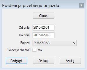 Wybieramy okres czasowy oraz pojazd dla jakiego ma być wykonany wydruk. Aby podejrzeć wygląd wydruku klikamy na przycisk Podgląd lub drukujemy bezpośrednio na drukarce klikając na przycisk Drukuj.