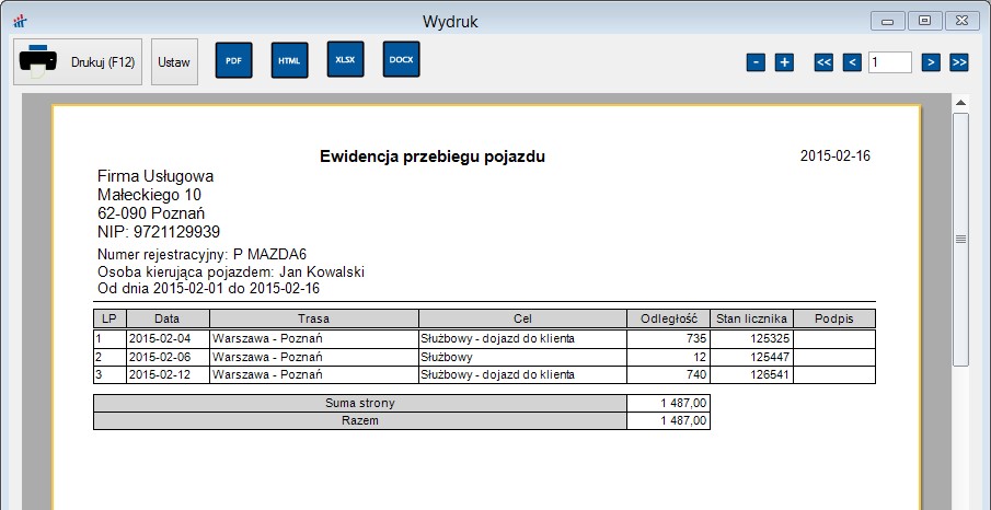 W przypadku wymaganej ewidencji dla potrzeb VAT należy oznaczyć podczas wydruku znacznik Ewidencja dla VAT. W takim wypadku na wydruku znajdują się informacje o ilości przebiegu oraz stanie licznika pojazdu na moment zakończenia trasy.