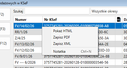 Kliknij prawym przyciskiem myszy na wybranej fakturze, aby otworzyć menu kontekstowe. Dostępne opcje to m.in.: