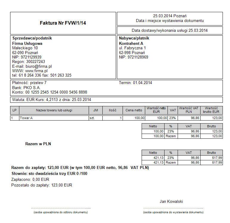 Przykład wydruku faktury walutowej