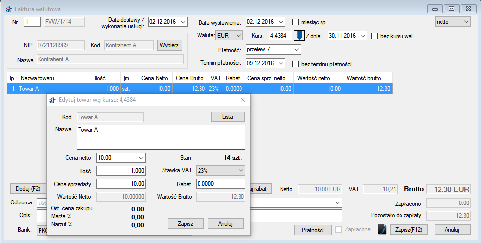Po wprowadzeniu kursu każdy towar dodawany do dokumentu będzie automatycznie przeliczany wg kursu i dodawany już w walucie.