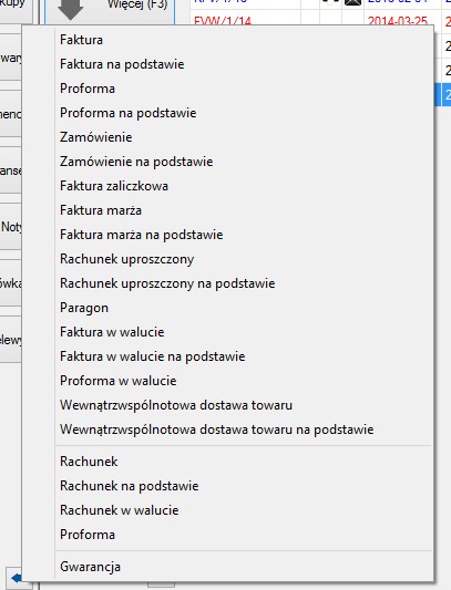 Wystawianie dokumentu faktura walutowa wykonuje się na liście dokumentów klikając na przycisk Więcej (F3) i z rozwijanego menu wybieramy Faktura w walucie.