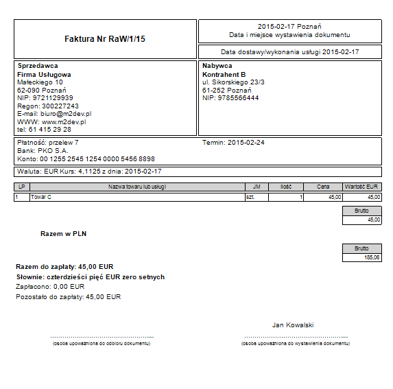 Przykład wydruku rachunku w walucie: