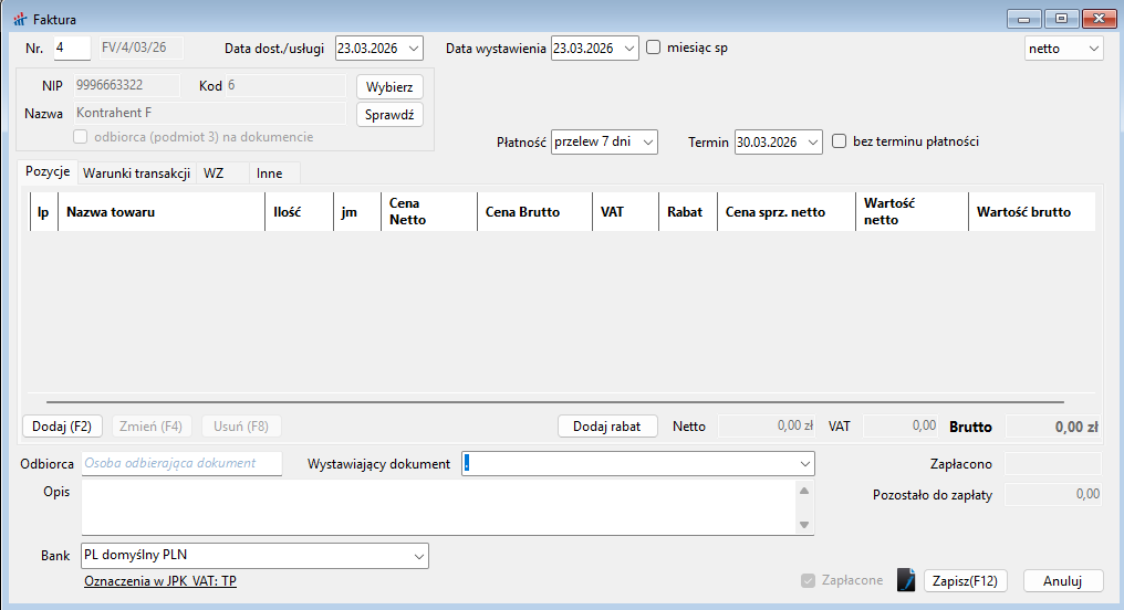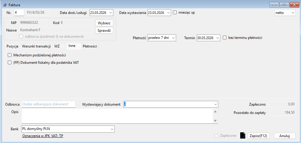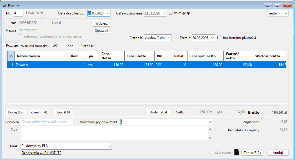 Po wybraniu kontrahenta na dokumencie pojawią się jego dane.
