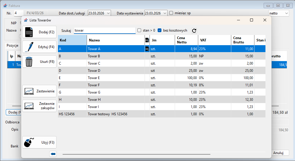 Pojawi się okno z wyborem listy towarów, towar wybieramy poprzez podwójne kliknięcie. Jeżeli towaru nie ma na liście należy użyć przycisku dodaj.