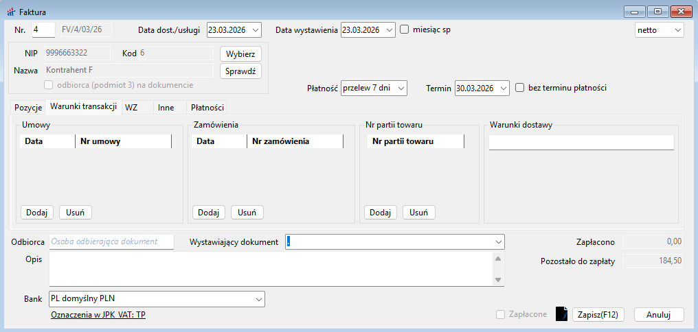 Jeżeli klient wymaga dodania do faktury dodatkowych danych jak Nr umowy, Nr zamówienia , Nr partii towaru lub Warunków dostawy, to możemy te pola wypełnić w zakładce Warunki transakcji.