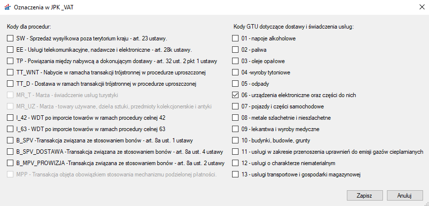 Do znaczenia kodów GTU i kody dla procedur sprzedaży należy kliknąć w pole Oznaczenia w JPK_VAT. Otworzy się okna z kodami GTU oraz kodami dla procedur. Kody GTU dodają się automatycznie w momencie dodania towaru, dla którego został wybrany odpowiedni kod. Można też ręcznie zmienić kody. Usunięcie towaru z kodem GTU nie powoduje usunięcie tego kodu z faktury, trzeba to zrobić ręcznie. Kod MPP dla mechanizmu podzielonej płatności zaznacza się bezpośrednio na fakturze a kody MR_T i MR_UZ wybierają się automatycznie jeżeli jest wystawiana faktura marża o danym opisie marży.