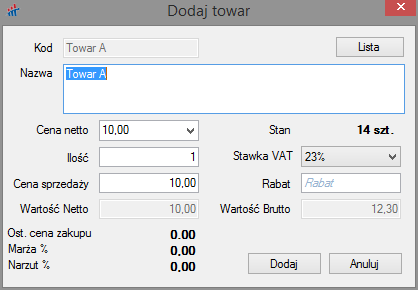 Po wybraniu towaru pojawi się okno z możliwością zmiany opisu towaru, wpisania lub wybraniu ceny podstawowej produktu (cena netto/brutto), od której wyliczany jest ewentualny rabat. Wprowadzamy ilości sprzedawanego produktu oraz cenę sprzedaży . Przy wpisaniu ceny sprzedaży od ceny netto/brutto zostaje automatycznie obliczony procent rabatu i analogicznie wpisanie rabatu zostanie automatycznie zmieniona cena sprzedaży.