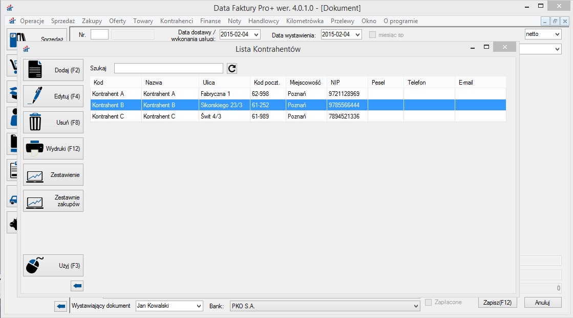 Pojawi się poniższe okno z dokumentem sprzedaży w tle oraz oknem wyboru kontrahenta. Wyszukujemy kontrahenta dla jakiego ma być wystawiony dokument i klikamy dwukrotnie na liście lub zaznaczmy i klikamy przycisk Użyj.