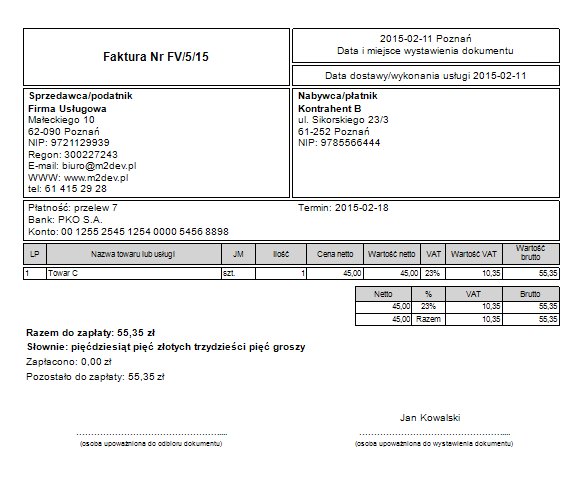 Po zapisie nowego dokumentu zostanie wyświetlone okno z podglądem wydruku . Można wtedy taki dokument wydrukować lub zapisać do PDF lub HTML, XLSX i DOCX. Można wybrać również kilka wyglądów wydruku i języków.