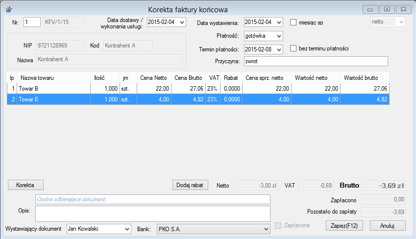 Po zapisie korekty program automatycznie obliczy ile jest nadpłaty lub niedopłaty.
