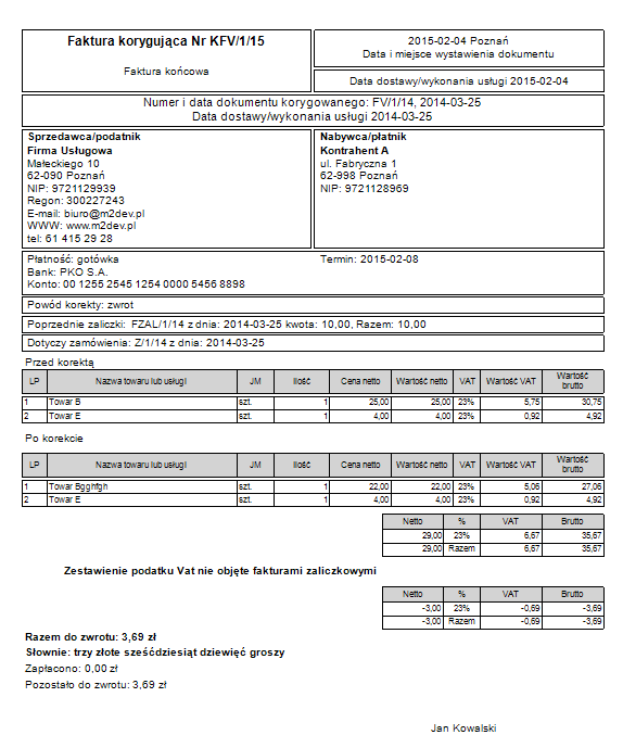 Przykład wydruku korekty
