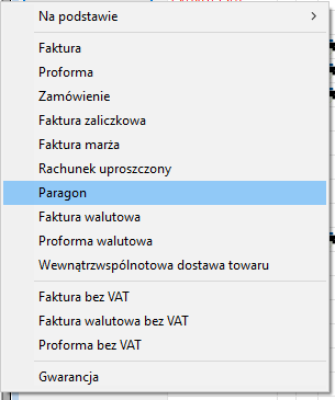 Wystawianie dokumentu Paragon wykonuje się na liście dokumentów klikając na przycisk Więcej (F3) i z rozwijanego menu wybieramy Paragon.