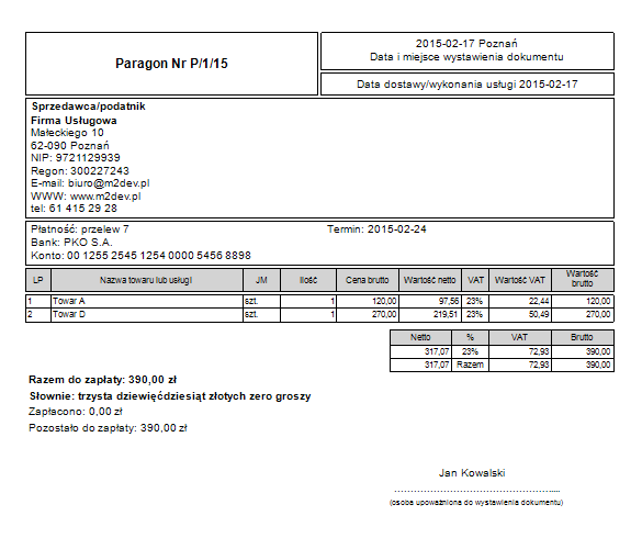 Przykład wydruku paragonu:
