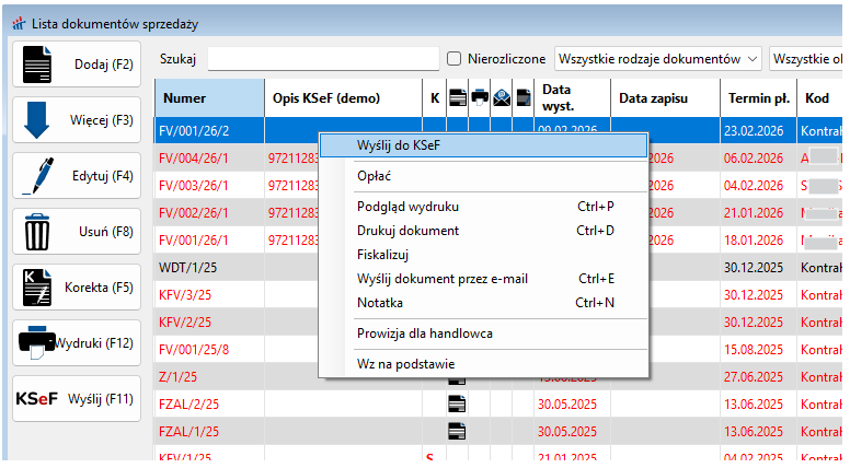 - Kliknij przycisk „KSeF” lub użyj prawego przycisku myszy i wybierz opcję „Wyślij do KSeF” z menu kontekstowego.