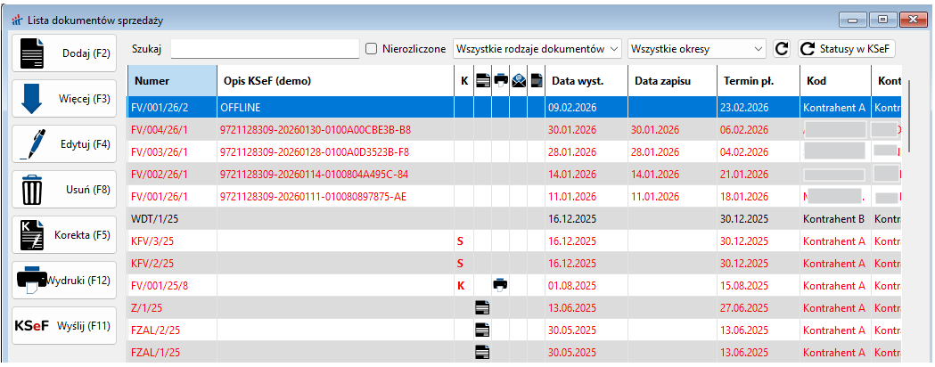 - „OFFLINE” - Dokument został wystawiony w trybie offline, z powodu braku internetu lub braku odpowiedzi KSeF, dokument musi być ponownie wysłany w 24 godziny, zostanie również automatycznie wysłany do KSeF podczas sprawdzania statusów , oraz przy uruchomieniu programu.